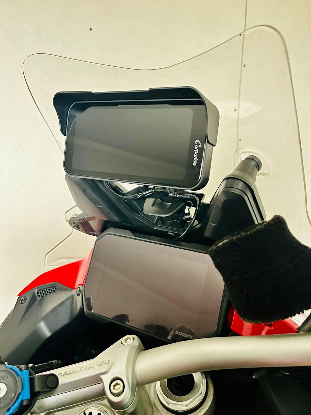 - Audio plays through helmet, visuals display on the Carpuride screen