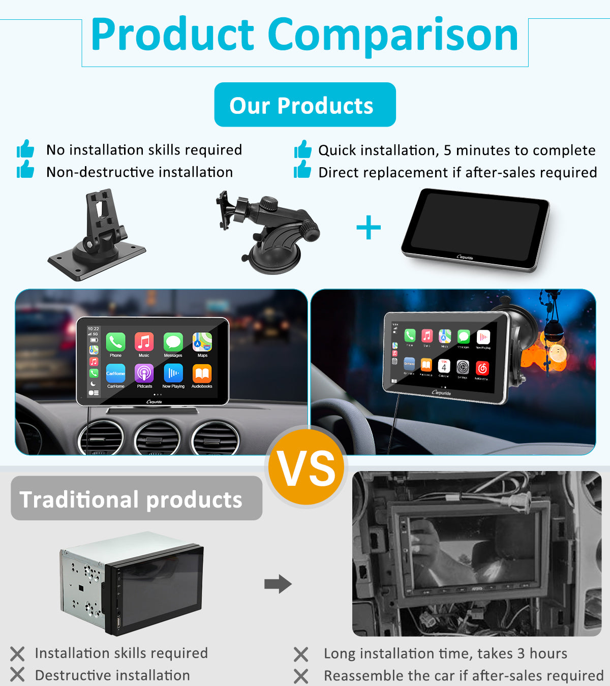 Bracket Type: Portable Sticker Bracket + Suction Cup BracketThe car stereo is equipped with the latest voice control technology. allowing you to make phone calls, navigate, play music with the help of an intelligent voice assistant.Built-in higher specification dual-channel imported Bluetooth 5.0 chip, the Bluetooth signal is more stable. When the car stereo is paired with your phone via Bluetooth, you can make smooth hands-free calls, music playback and control. Driving is safer and more convenient.7 '' IPS touchscreen car stereo has resolution 1024 * 600, support 1080P video playback, enjoy a large screen movie, map and other complete features.Android/IOS mirroring function is supported. You can connect your phone to the car stereo system via the original data cable to easily connect and sync the content (video, GPS, etc.)Compared to the normal car stereo 12V voltage setting, we have 12-24V. Both cars and trucks can be used. And with a USB output of 2.1A, it can also be charged when connected to a mobile phone.We can upgrade the boot logo for free, completely personalised. For example, set your boot logo to match your model, or set the boot screen to your preferred personal or family photo, etc. Simply send us your preferred boot logo or picture.