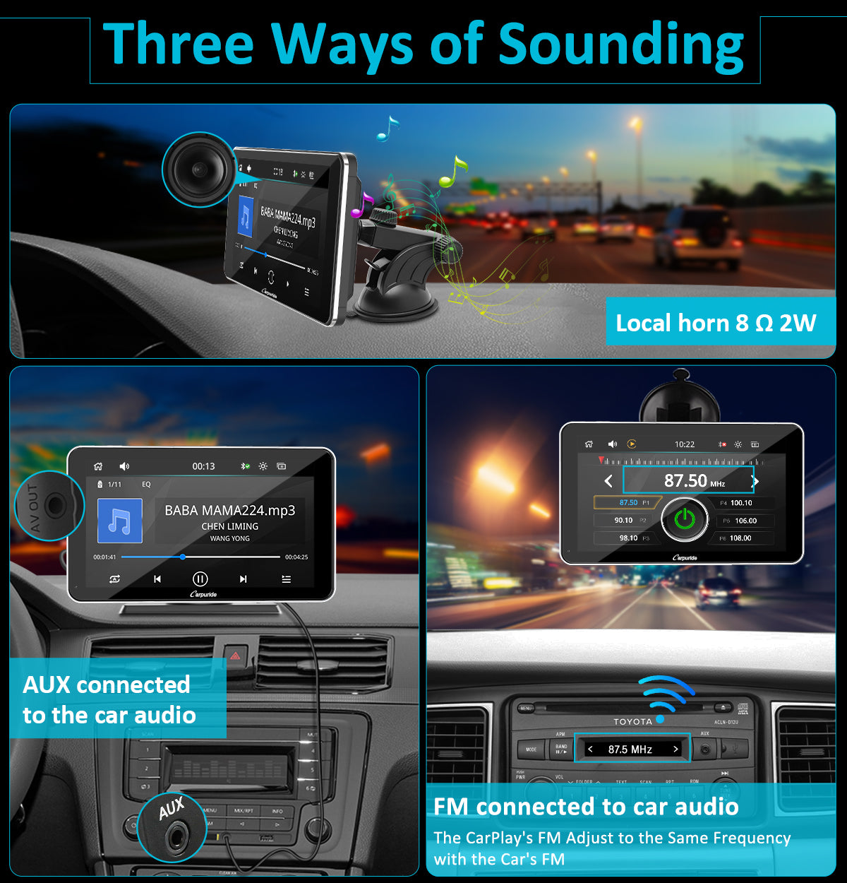 Three kinds of audio output: FM transmitter/AUX cable/ Built-in 2W speaker