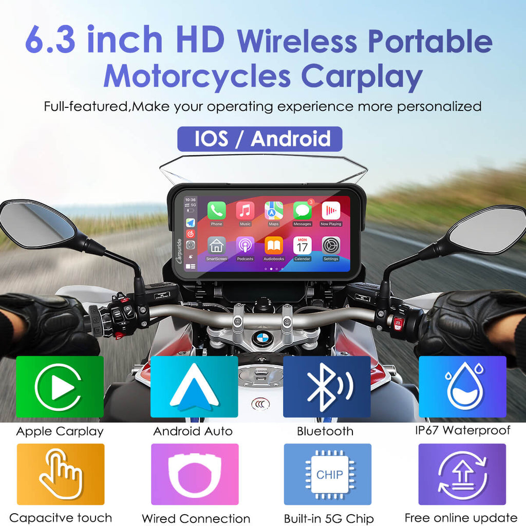 This device supports both iOS and Android systems, offering a rich set of features for a personalized experience. It includes Apple CarPlay, Android Auto, Bluetooth connectivity, IP67 Waterproof, capacitive touch control, wired connection, an integrated 5G chip, and free software updates. Perfect for enhancing your motorcycle experience, this device serves as an all-in-one solution of a reliable motorcycle GPS unit.