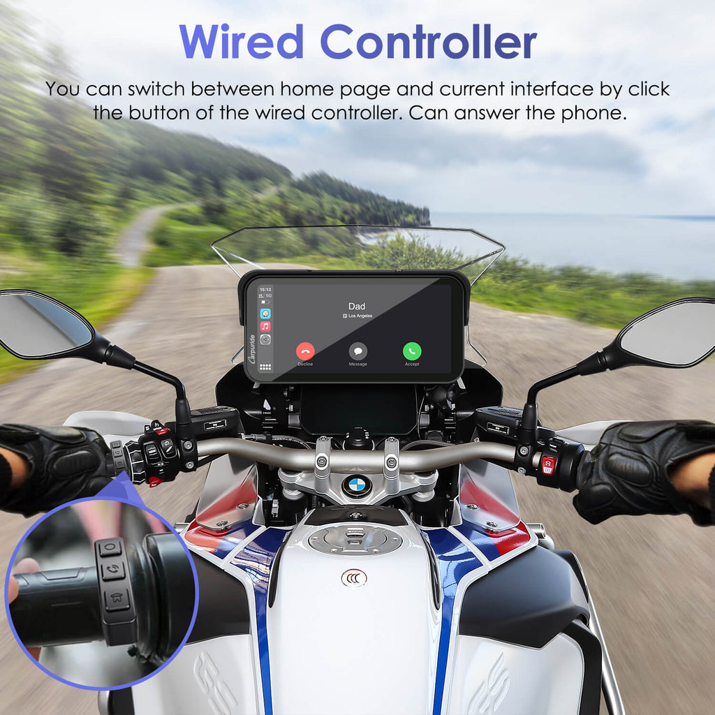 Carpuride W603B is equipped with a Wired Controller, which can switch between the home page and the current interface by clicking the button of the wired controller. It can answer the phone. (Note: 1. Use the Android phone to connect to Carpuride Moto, don't use the cycle button to answer incoming calls.